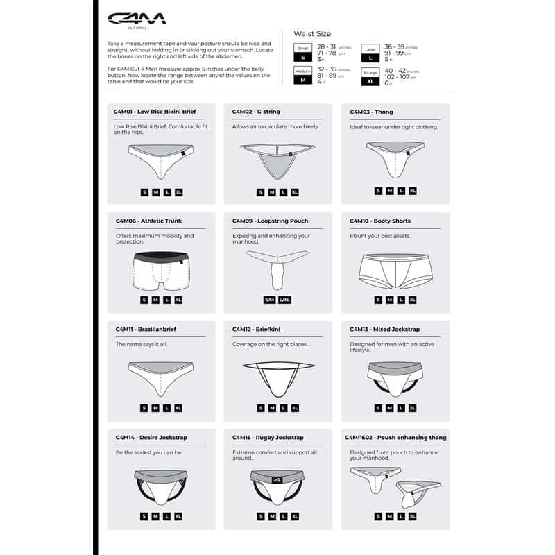 Disse trusser er fremstillet af en blanding af 95% premium bomuld og 5% elastan af høj kvalitet og tilbyder den perfekte kombination af blødhed, strækbarhed og holdbarhed. For at bevare deres perfekte stand, maskinvaskes de koldt med lignende farver, tørretumbles ved lav temperatur og undgå blegning. Stryges på lav temperatur, hvis det er nødvendigt. Fås i en række størrelser. Se venligst vores størrelsesguide for den perfekte pasform. C4 MSPX07 Capri Brief er mere end bare undertøj; det er en forpligtelse til komfort, kvalitet og stil.
