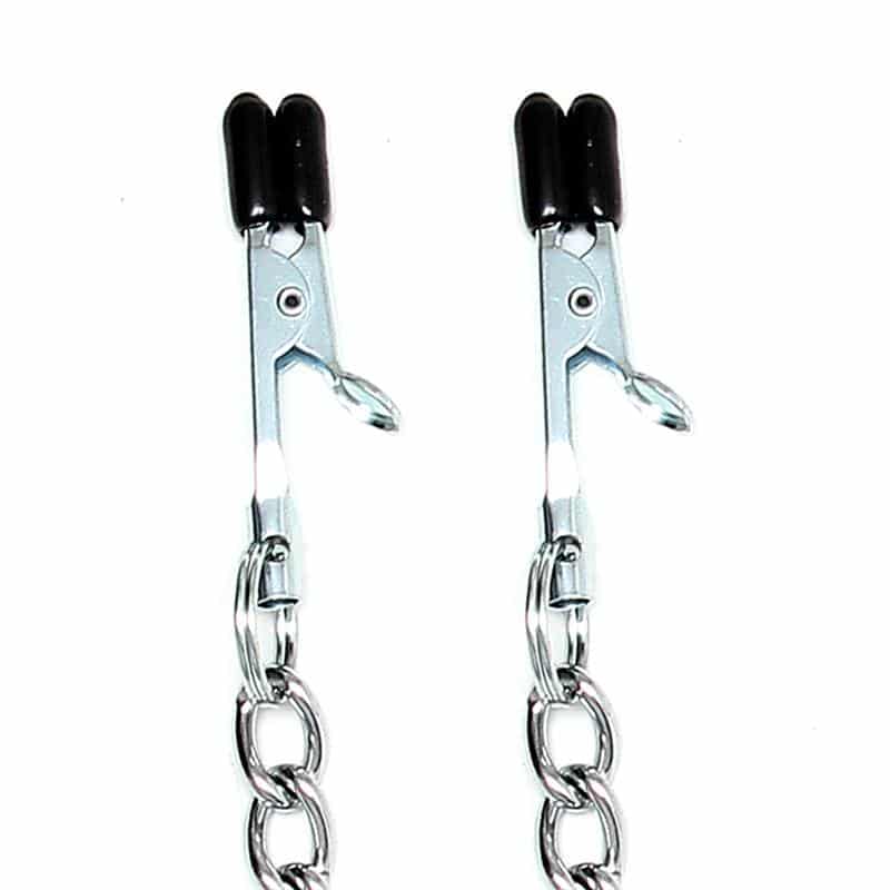 Lev forskellige oplevelser med disse nippelklemmer af metal. Bruges med oprejste brystvorter. De to clips er forbundet med en metalkæde.